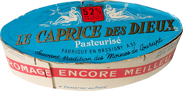 Its oval shape and blue colour suit it well, it is a joyful and gourmet nod to the round and square boxes of cheese of the time. On these wooden boxes still assembled by hand, Zeus and Poseidon take good care of this gourmet oval cheese. On June 21, 1956, the first package of Caprice des Dieux was sold! That's it... the adventure begins!